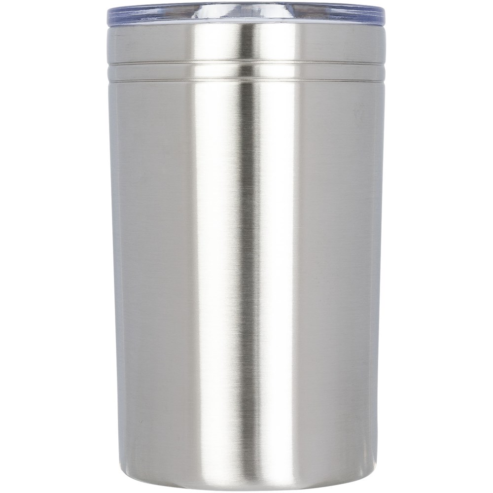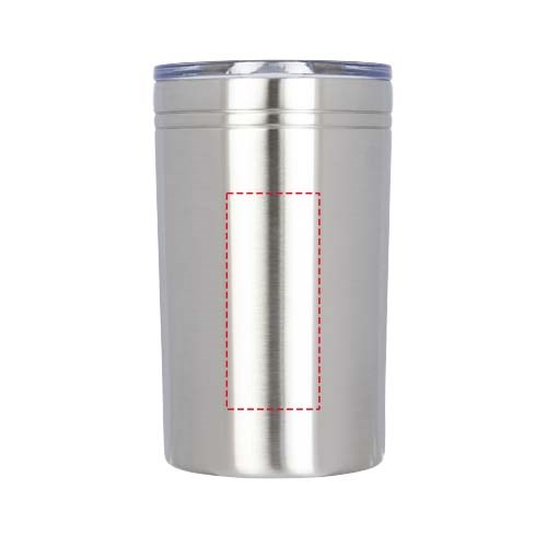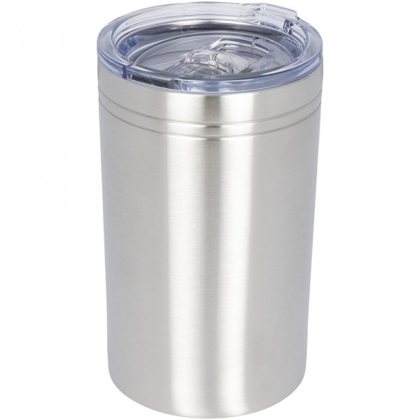 Doppelwandige Konstruktion, vakuumisoliert. Durchsichtiger Stülpdeckel mit Schiebeverschluss. Funktioniert als Becher oder Getränkeisolator. Fassungsvermögen 330 ml.