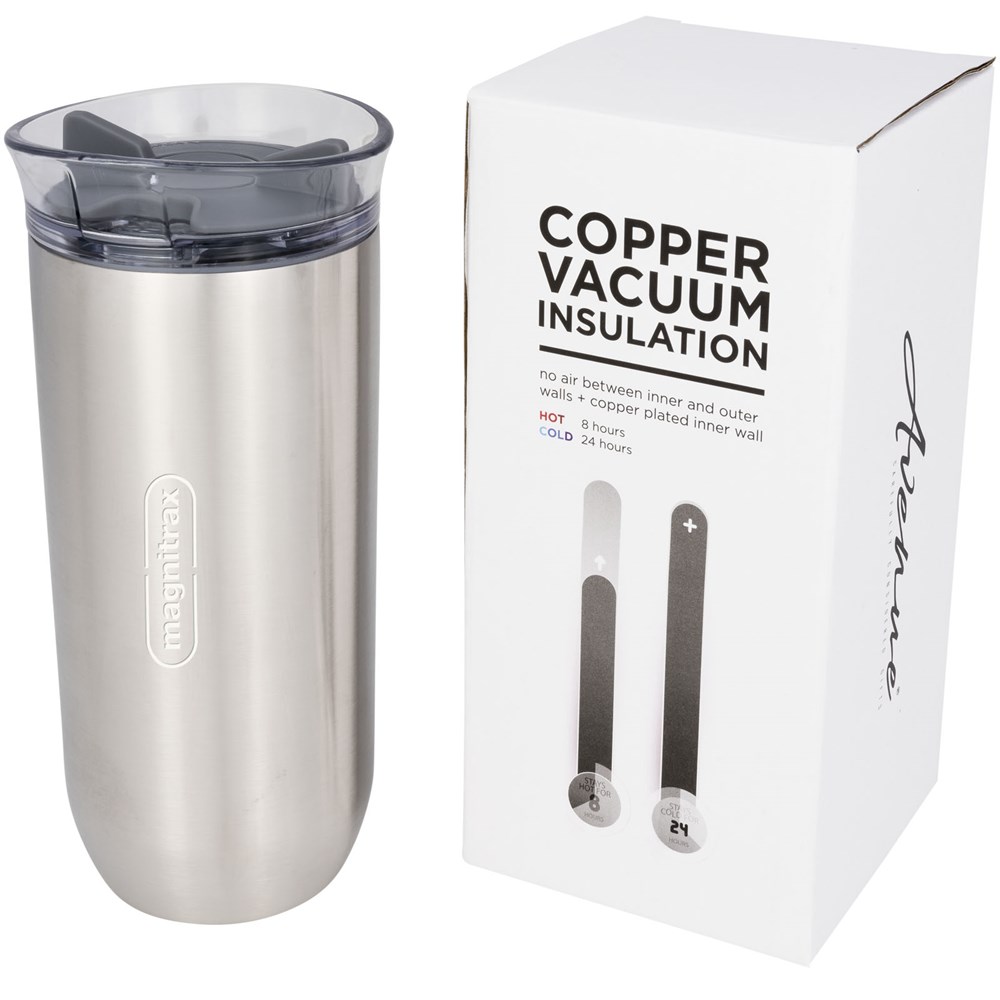 Auslaufsicheres Design, aufschraubbarer, aufdrehbarer Deckel. Doppelwandiges Kupfer, vakuumisolierte Edelstahlkonstruktion. Hält Getränke 8 Stunden warm und 24 Stunden kalt. Das Fassungsvermögen beträgt 470ml. Präsentiert in einer Avenue Geschenkschachtel.
