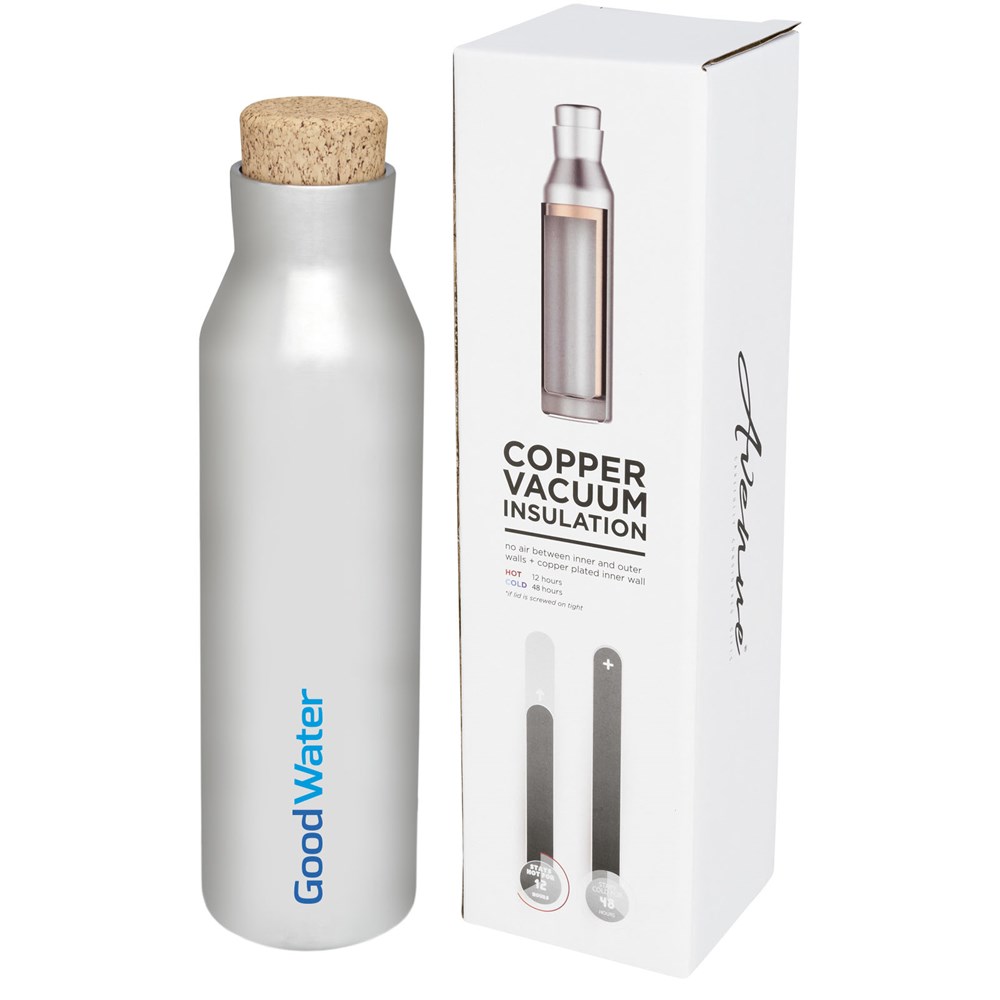 Robuste, doppelwandige Edelstahl-Vakuumkonstruktion mit Kupferisolierung, welche dafür sorgt, dass Ihr Getränk 12 Stunden lang heiß und 48 Stunden lang kalt bleibt. Die Konstruktion verhindert auch eine Kondensation auf der Außenseite der Flasche und der Deckel ist verschüttungsresistent. Die Flasche verfügt über ein innovatives Schraubdeckel-Design in Kork-Optik. Passend für die meisten gängigen Auto-Getränkehalterungen. Das Fassungsvermögen beträgt 590ml. Verpackt in einer Avenue Geschenkbox.