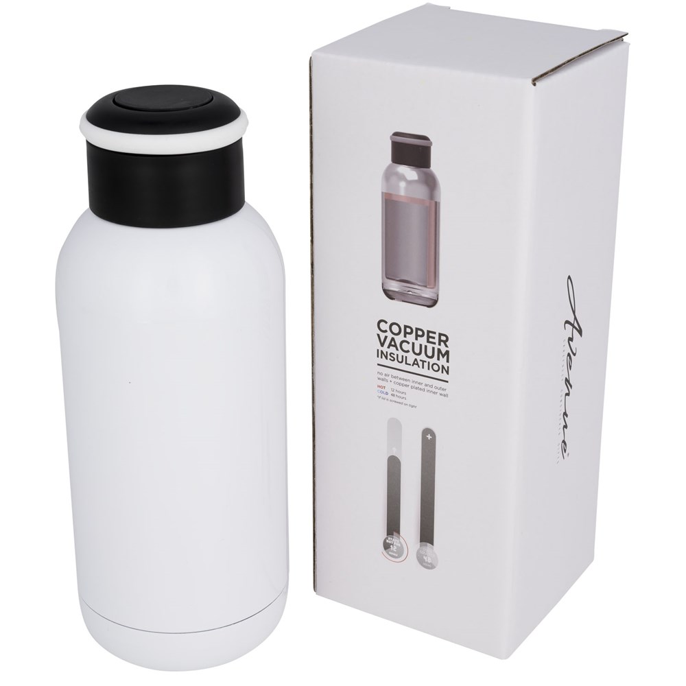Flasche aus doppelwandigem Edelstahl mit Vakuum-Isolierung. Die Innenwand ist für ultimative Leitfähigkeit mit Kupfer beschichtet, um Getränke 8 Stunden heiß und 48 Stunden kalt zu halten. Schraubverschluss mit integriertem Silikonriemen. Breite Öffnung für einfaches Reinigen und Befüllen. Das Fassungsvermögen beträgt 350ml. Präsentiert in einer Avenue Geschenkschachtel.