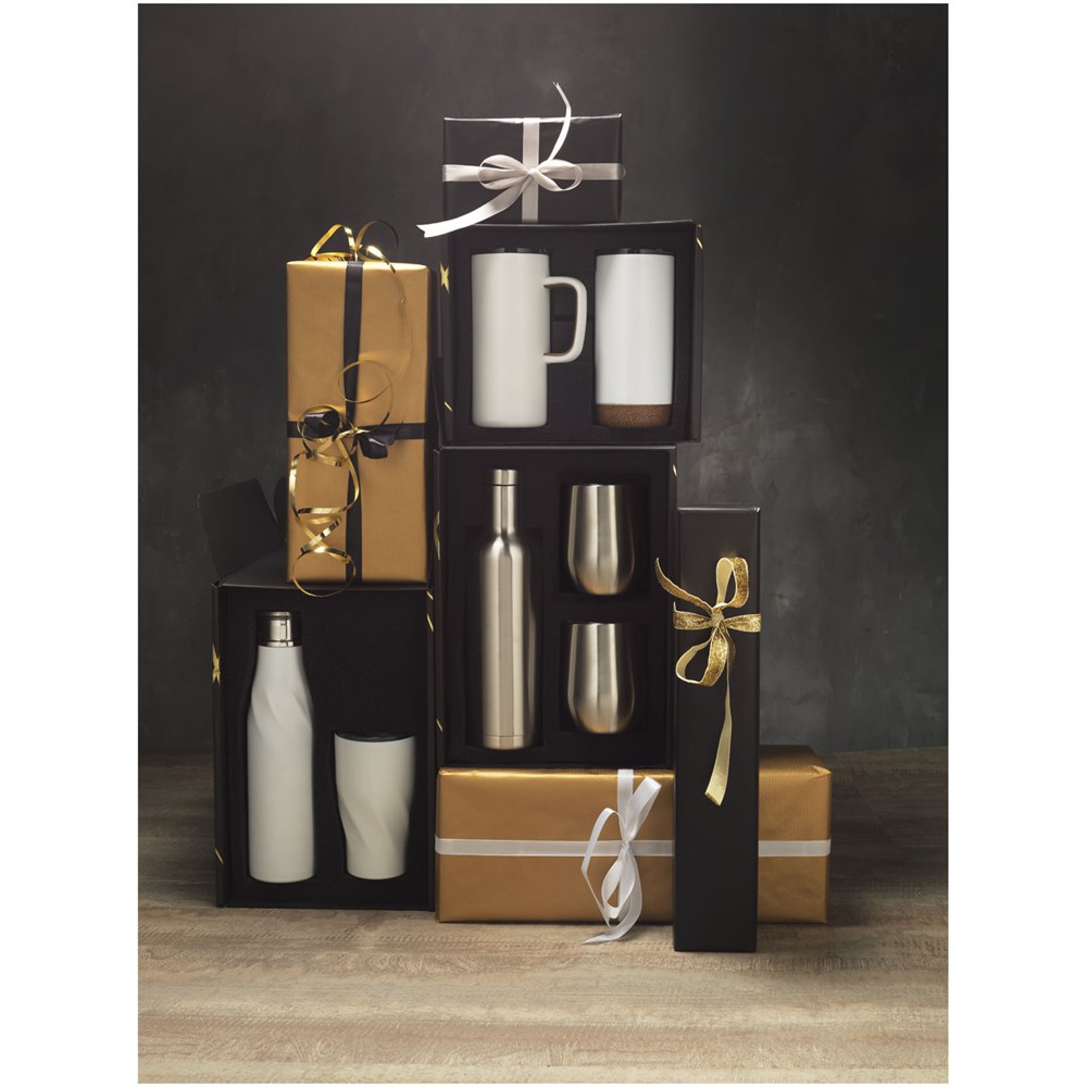 Geschenkset mit einer Kupfer-Vakuumflasche Pinto (750 ml) und zwei Kupfer-Vakuumbechern Corzo (350 ml). Präsentiert in einer schwarzen Geschenkbox mit glänzenden goldfarbenen Details.