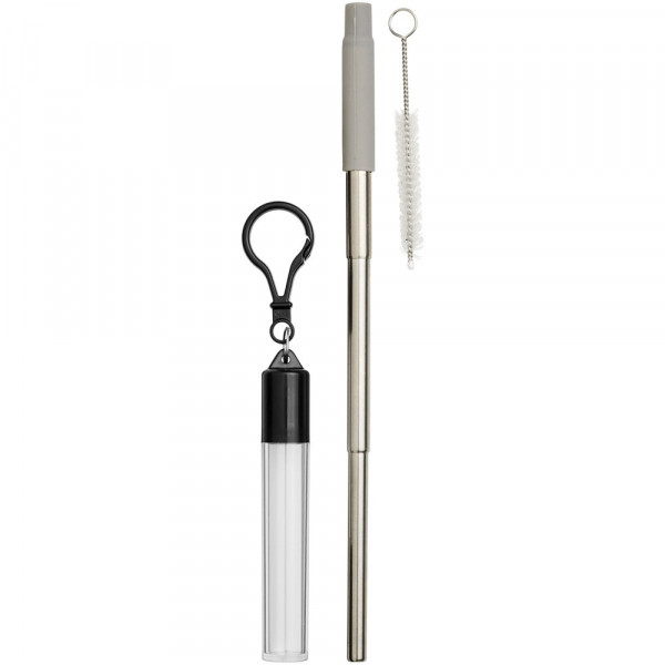 Wiederverwendbarer Strohhalm aus Edelstahl mit Silikonspitze, Strohhalmbürste und Schutztasche mit Karabinerhaken. Der Strohhalm kann eingefahren werden, so dass er in die Schutztasche passt, und misst in ausgefahrenem Zustand 21 cm. Geeignet für kalte Getränke.