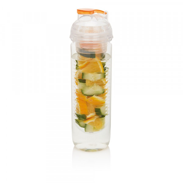 500ml Tritan Flasche mit Früchte-Aromafach. Bereichern Sie Ihr Wasser mit Vitaminen und einer Menge Geschmack durch das einfache Hinzufügen von frischen Früchten im Aromafach. Dieses Fach kann durch die Zugabe von Eiswürfeln auch als Kühlfach verwendet werden. Nur Handwäsche.
