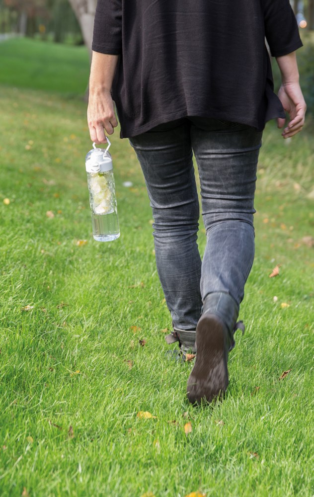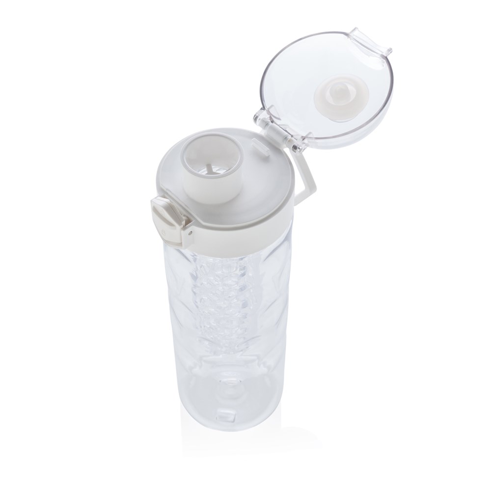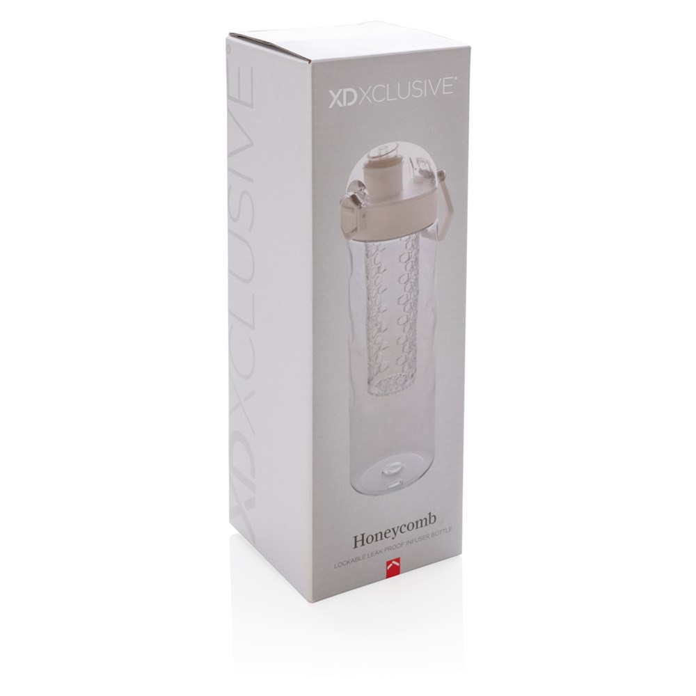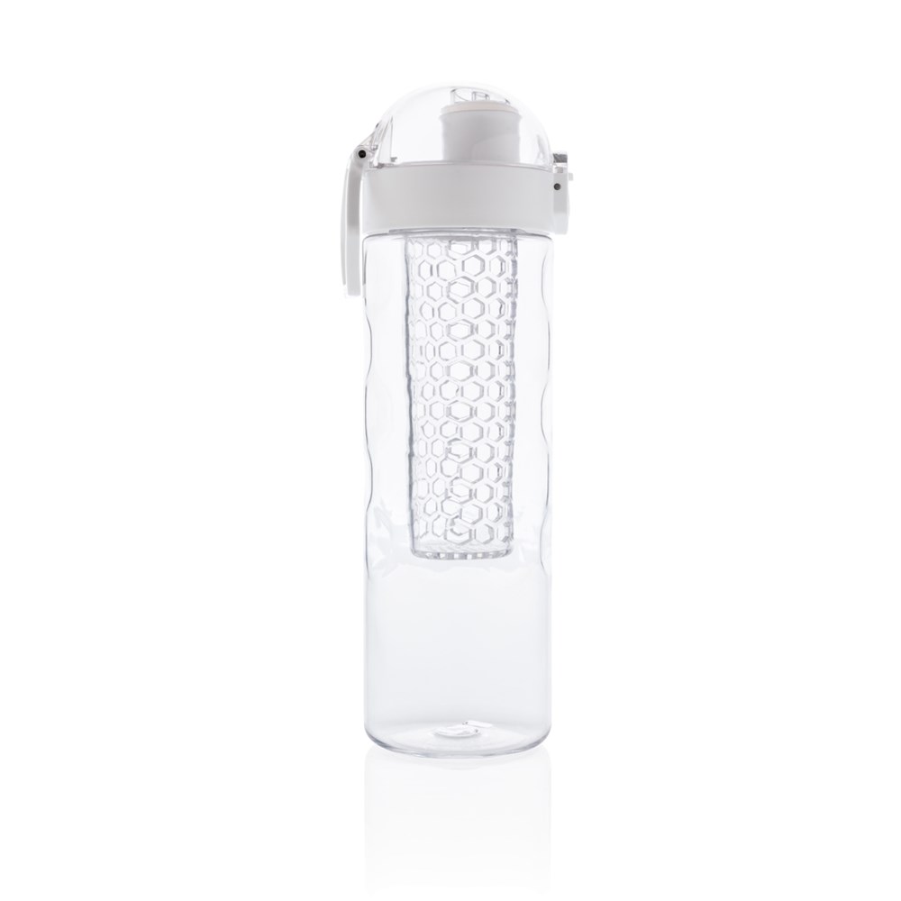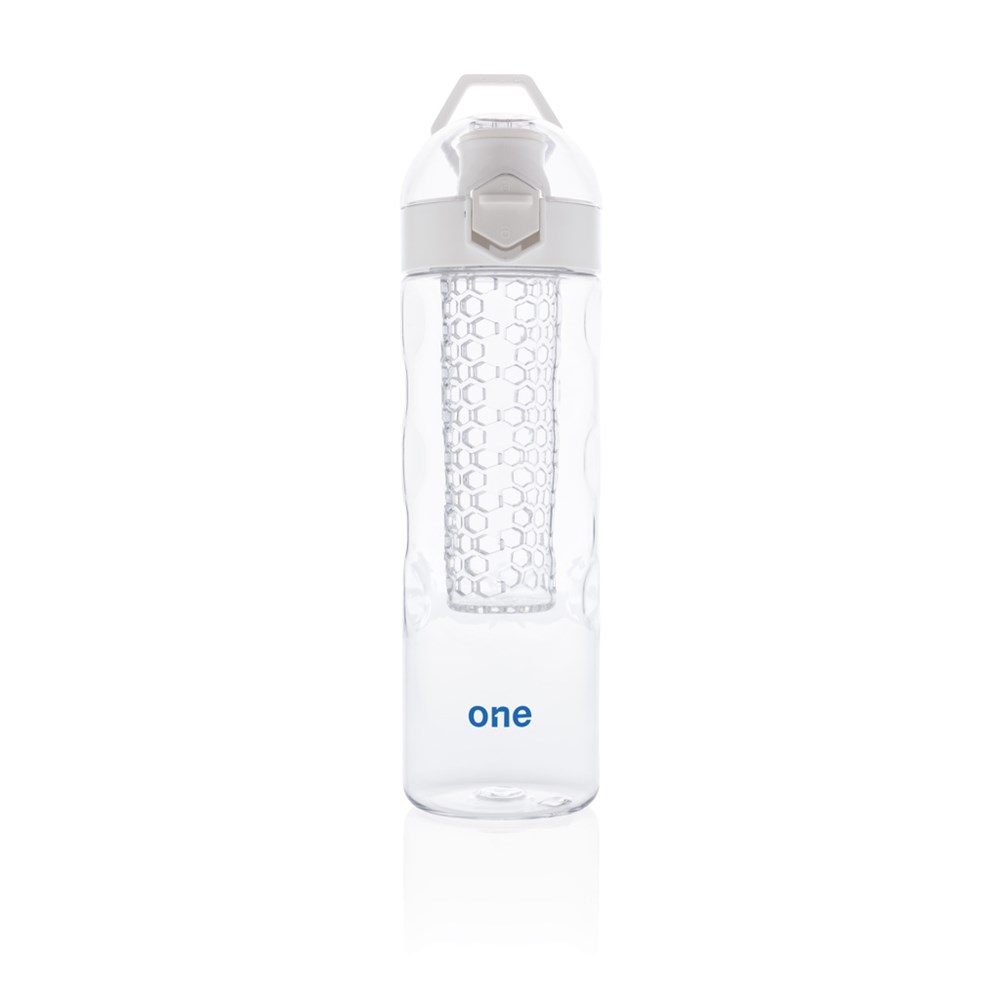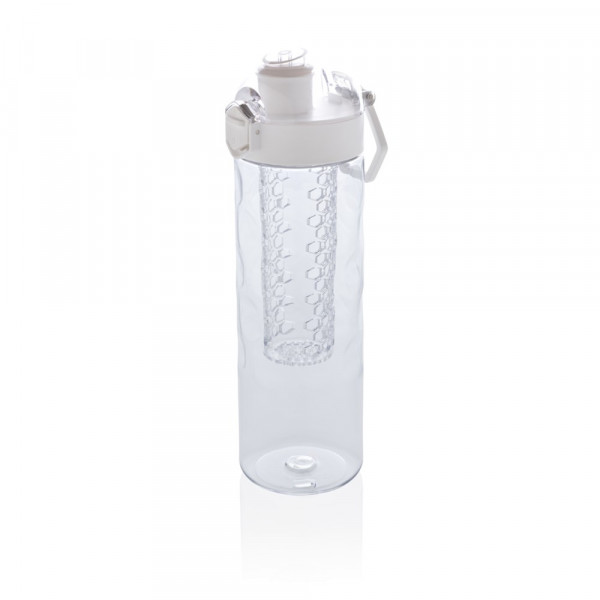 Geben Sie gesunde Früchte hinzu um Ihr Wasser zu aromatisieren. Mit ihrem Wabendesign liegt perfekt die Flasche in Ihrer Hand. Drücken Sie den Knopf und der Deckel springt auf, es gibt aber auch einen speziellen Schließmechanismus, der davor bewahrt die Flasche aus Versehen zu öffnen. Mit Trageriemen. Hergestellt aus langlebigem und innovativem Tritan. 100% BPA-frei. Inhalt: 700ml. Nur Handwäsche. Registered design®