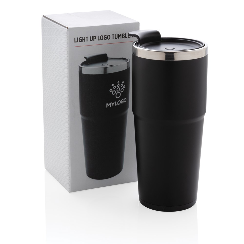 Doppelwandiger Isolierbecher aus 304 SS innen und ABS Plastik außen. Veredeln Sie Ihren Becher mit einer Gravur und nach Anheben und Schwenken des Isolierbechers leuchtet das Logo auf. Inklusive 2 CR2032 Knopfbatterien. Inhalt: 480ml. Nur Handwäsche.