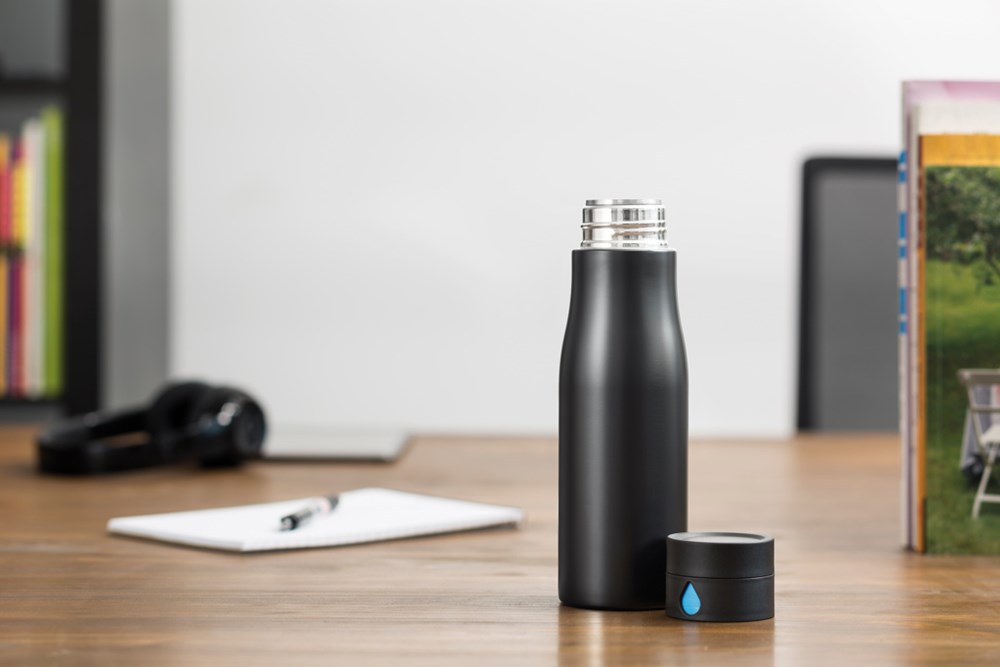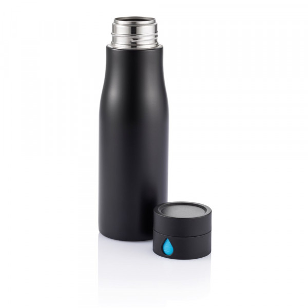 Verfolgen Sie Ihre tägliche Flüssigkeitsaufnahme mit dieser smart gestylten und auslaufsicheren 650ml Wasserflasche aus Edelstahl. Der Deckel zeigt jedes Mal, wenn Sie die Flasche nachfüllen und den Deckel zudrehen, einen gefüllteren Wassertropfen an, damit Sie leicht die Anzahl getrunkener Flaschen mitzählen können. Reinigung per Handwäsche wird empfohlen. Geschütztes Design®