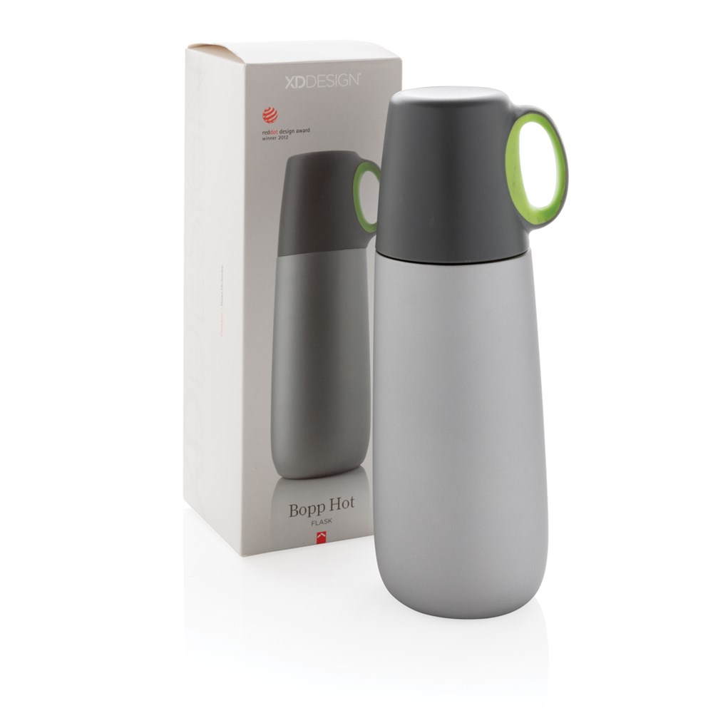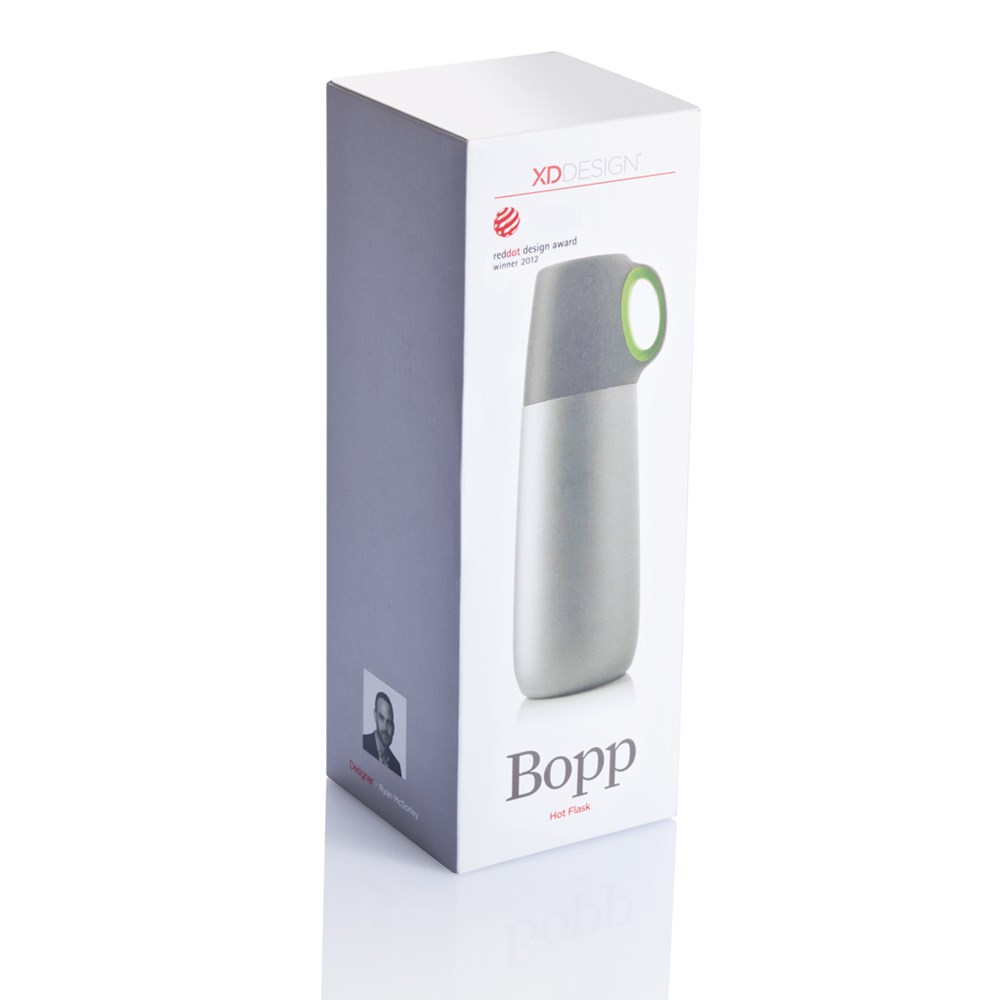 Die 600ml Bopp Hot Isolierflasche in mattem Finish, mit Druckverschluss und Henkeltasse, ist das ideale Accessoire für jeden Kaffeeliebhaber. Nur Handwäsche. Geschütztes Design®