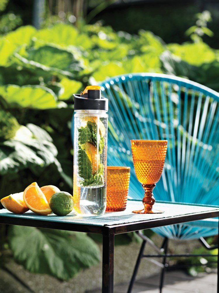 800ml Tritan Flasche mit Früchte-Aromafach. Bereichern Sie Ihr Wasser mit Vitaminen und einer Menge Geschmack durch das einfache Hinzufügen von frischen Früchten im Aromafach. Dieses Fach kann durch das Zusetzen von Eiswürfeln auch als Kühlfach verwendet werden. Nur Handwäsche.