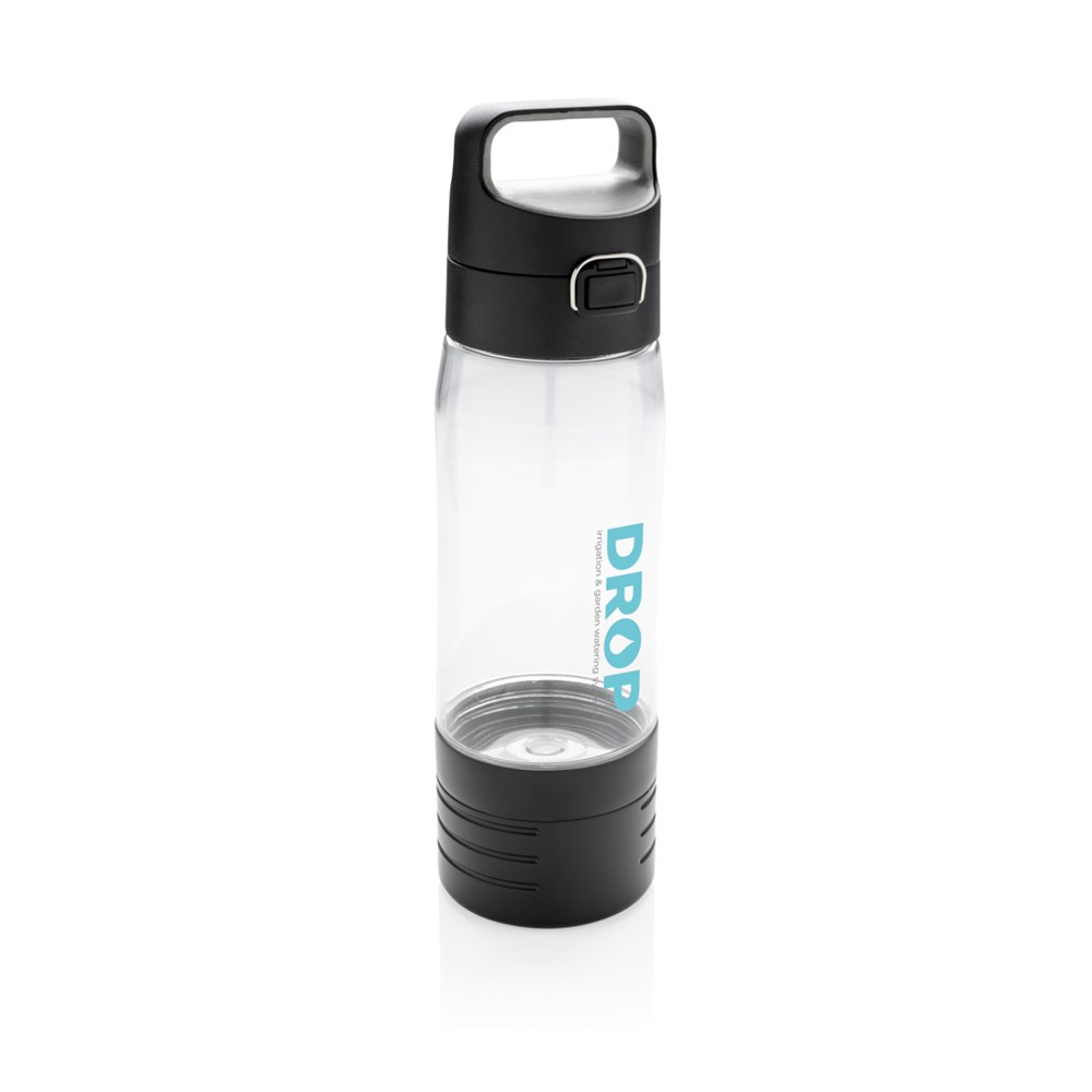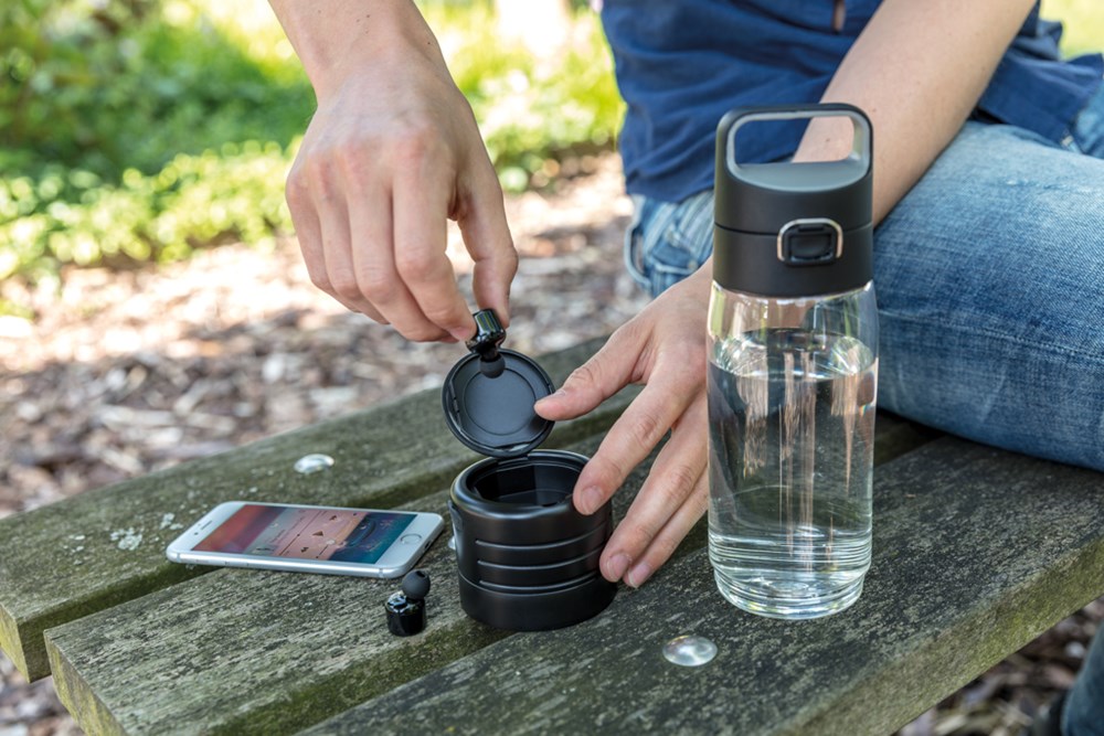 Auslaufsichere Tritanflasche mit Verschlussfunktion und Griff. Inhalt: 600ml. An der Seite der Flasche befindet sich eine Möglichkeit die 60 mAh True-Wireless Kopfhörer sicher aufzubewahren und aufzuladen. Die 600mAh Batterie sorgt für Musikgenuss von bis zu 3h. Inklusive 50cm Micro-USB Ladekabel. Nur Handwäsche. Registered design®