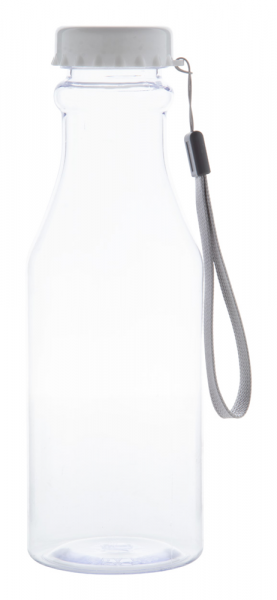 Transparente Trinkflasche aus Kunststoff mit Schraubverschluss-Deckel und Trageschlaufe. Füllmenge: 500 ml.