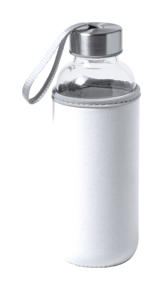 Trinkflasche aus Glas mit Trageschlaufe und farbiger Neoprenhülle. Füllmenge: 420 ml.