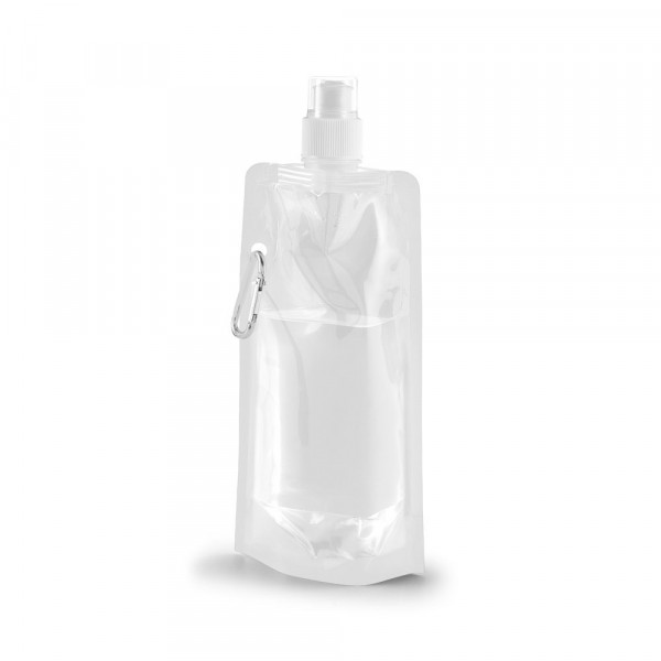 Faltbare Trinkflasche aus PE (460 ml) mit Karabiner, Deckel und Push-Pull System. 110 x 218 x 64 mm