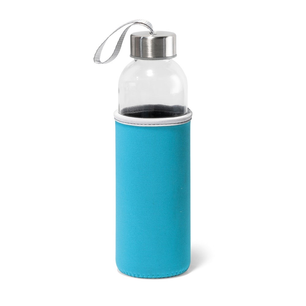 Trinkflasche aus Glas (520 ml) mit farbiger Softshell-Ummantelung. Der Deckel ist aussen aus Edelstahl und hat innen einen Kunstoffeinsatz. Die Schlaufe auf dem Deckel ermöglicht das Mitnehmen. ø65 x 225 mm