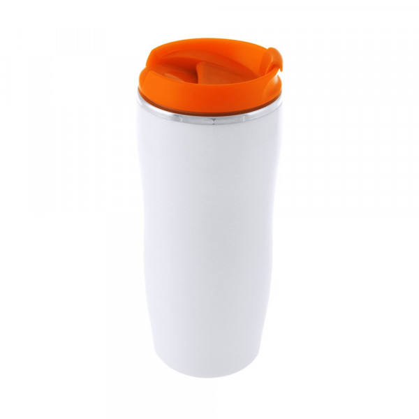 Becher aus Edelstahl mit 400 ml Fassungsvermögen und weißem Metallgehäuse mit Kontrastdetails in kräftigen Farben. Mit Sicherheitsdeckel. Präsentiert in einer individuellen Box.