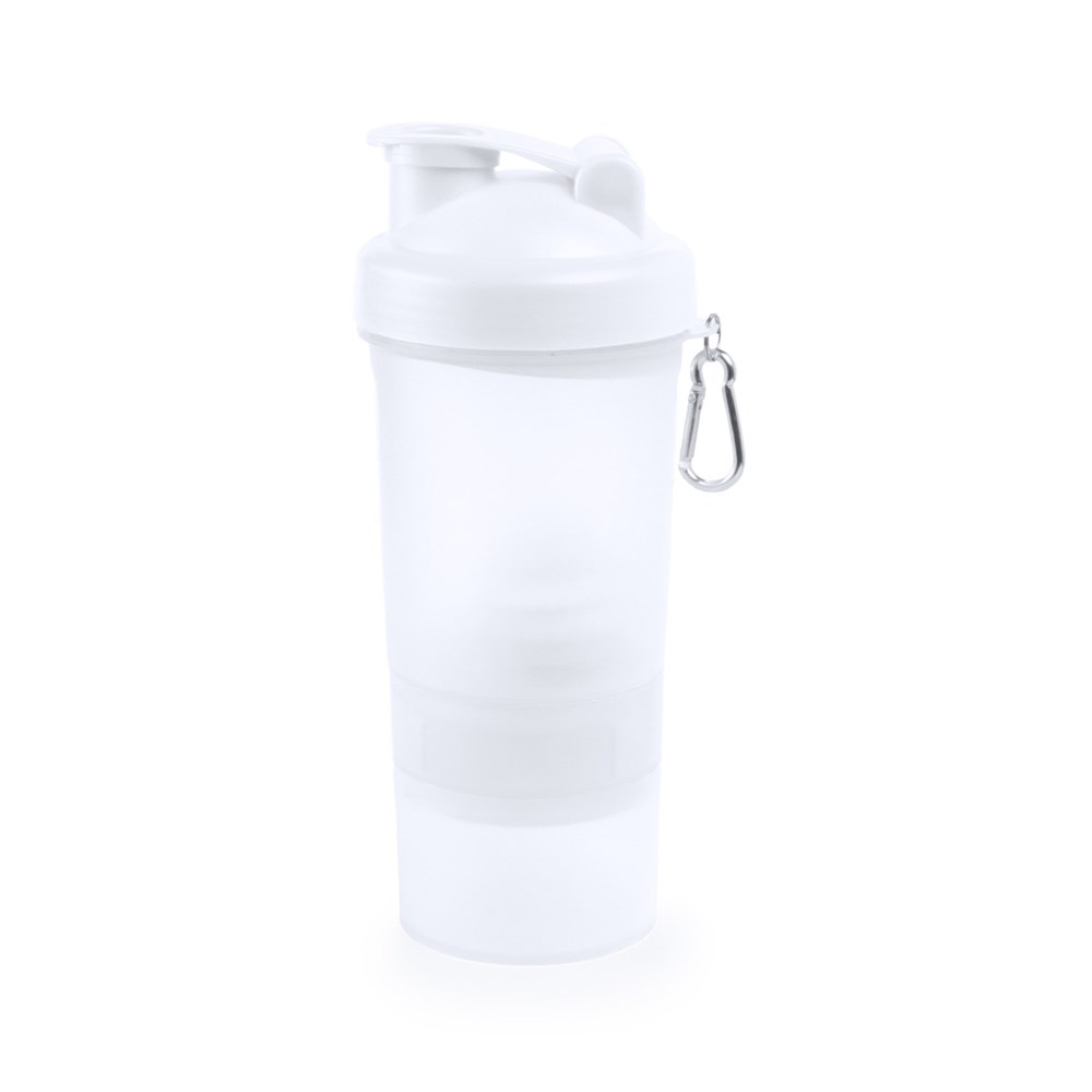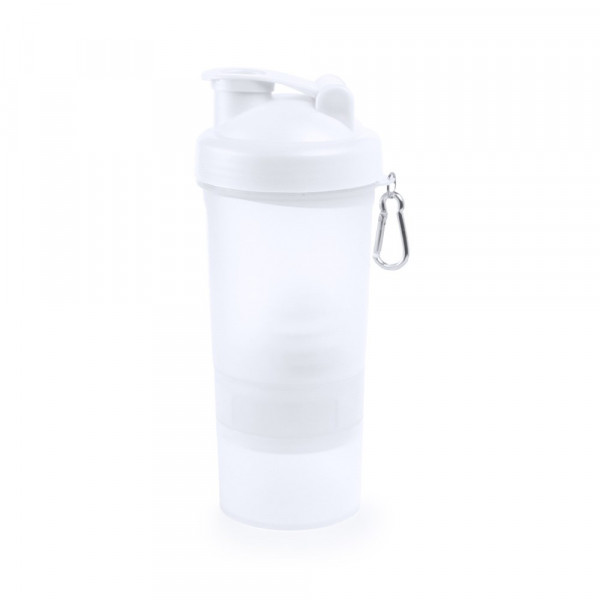 Shaker mit 400 ml Fassungsvermögen aus Polypropylen (PP) mit verschiedenen Kammern sowie Sieb und Metallball mit Schneebesen-Effekt. Zudem mit Schraubverschluss, Sicherheitsspender und Metallkarabiner.