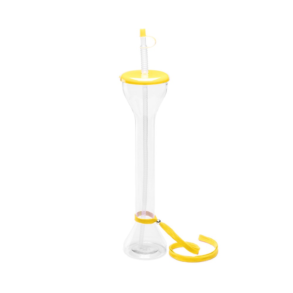 Außergewöhnlicher PET-Becher mit 650 ml Fassungsvermögen, transparentem Körper und Kontrastdetails in verschiedenen kräftigen Farben. Mit flexiblem Strohhalm sowie Polyester-Trageschlaufe mit Stopper.