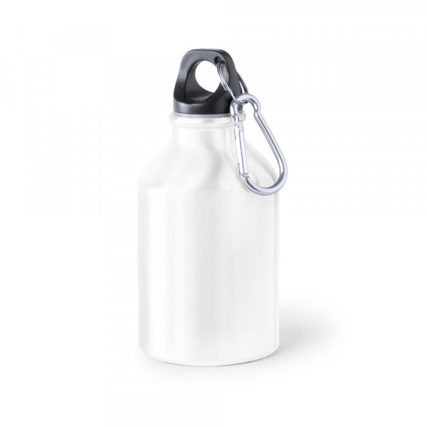 Trinkflasche mit 330 ml Fassungsvermögen aus Aluminium in verschiedenen lebendigen Farben. Mit Sicherheitsverschluss und Metallkarabiner. Präsentiert in einer attraktiven Designbox.