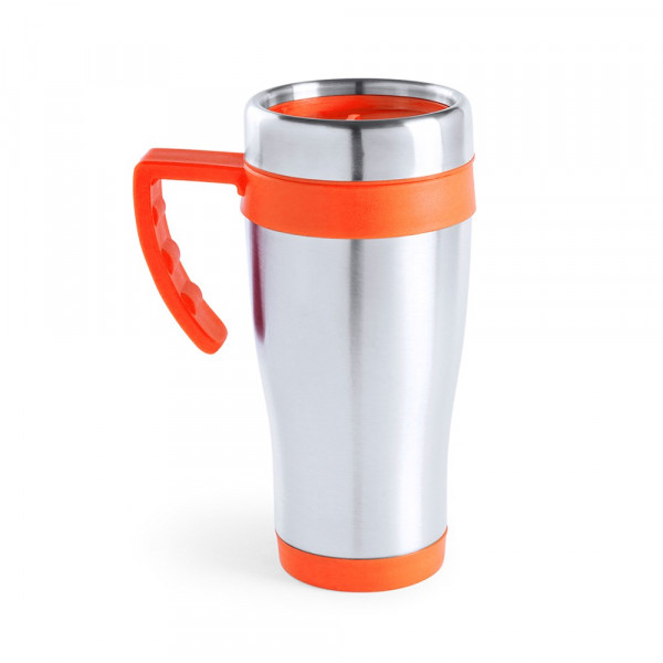 Becher aus Edelstahl mit 450 ml Fassungsvermögen und glänzendem Finish mit farblich passenden Kontrastdetails in lebendigen Farben. Mit Griff und Deckel mit Sicherheitsspender. Präsentiert in einer attraktiven Designbox.