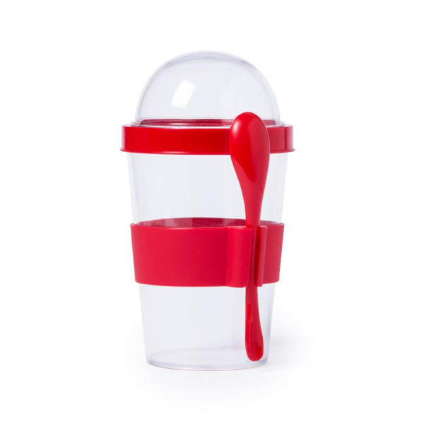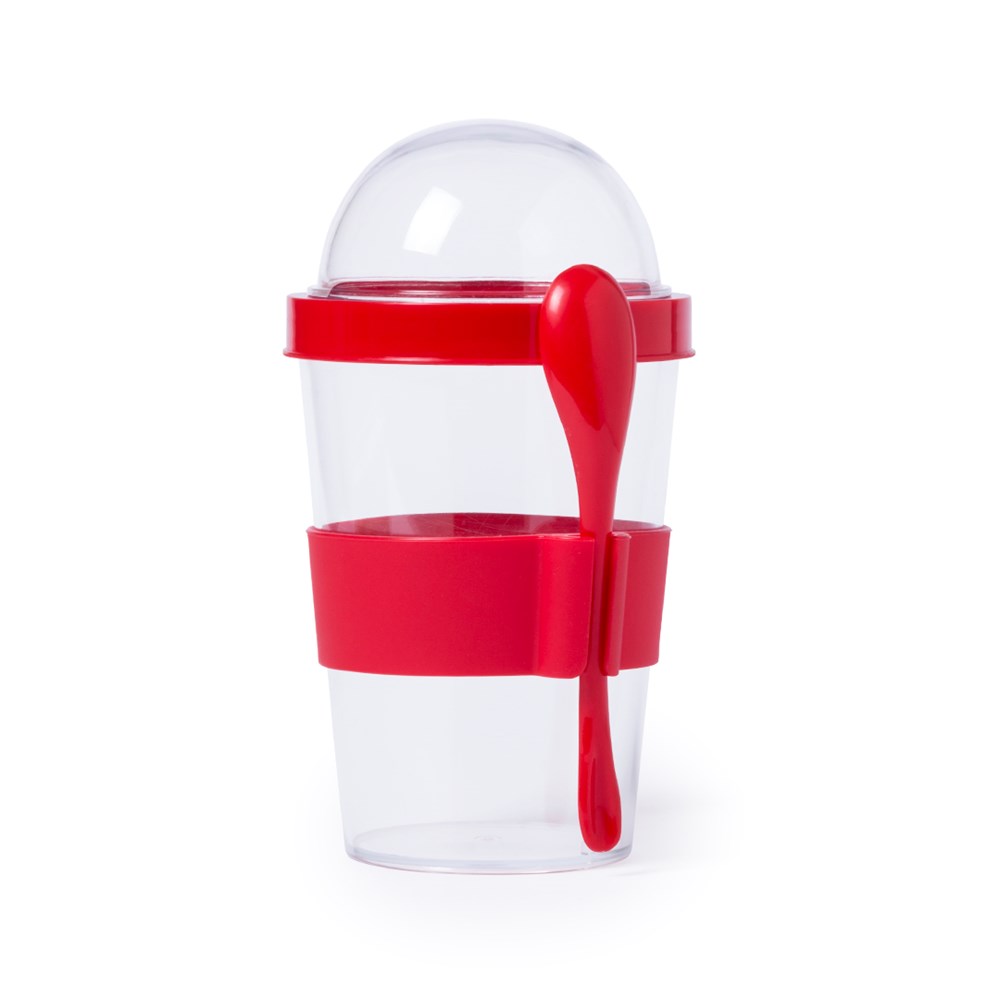 Becher mit 420 ml Fassungsvermögen aus resistentem PS-Kunststoff in transparenter Ausführung. Mit separatem Fach im Deckel und seitlichem Löffelhalter. Deckel und Löffel in verschiedenen lebendigen Farben.