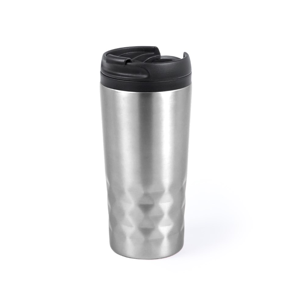 Edelstahlbecher mit 310 ml Fassungsvermögen in lebendigen Farben und glänzender Ausführung mit Rauten-Design. Deckel mit Sicherheitsspender und weicher, mit Schaumstoff gepolsterter Boden. Präsentiert in einer individuellen Box.