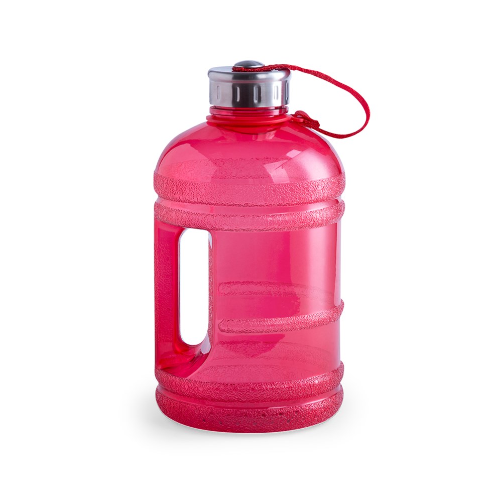 Trinkflasche aus PET mit einem Fassungsvermögen von 1,89 l. Mit Gehäuse in einer Vielzahl von lebendigen transparenten Farben, Sicherheitsschraubverschluss aus Edelstahl, farblich passendem Trageband und praktischem Griff.