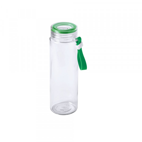 Flasche mit 420 ml Fassungsvermögen aus Glas. Transparenter Körper, mit Details in auffälligen Farben. Aufschraubbarer, BPA-freier Deckel und verstellbarer Tragegriff in passender Farbe. Präsentiert in einer attraktiven Design-Box.