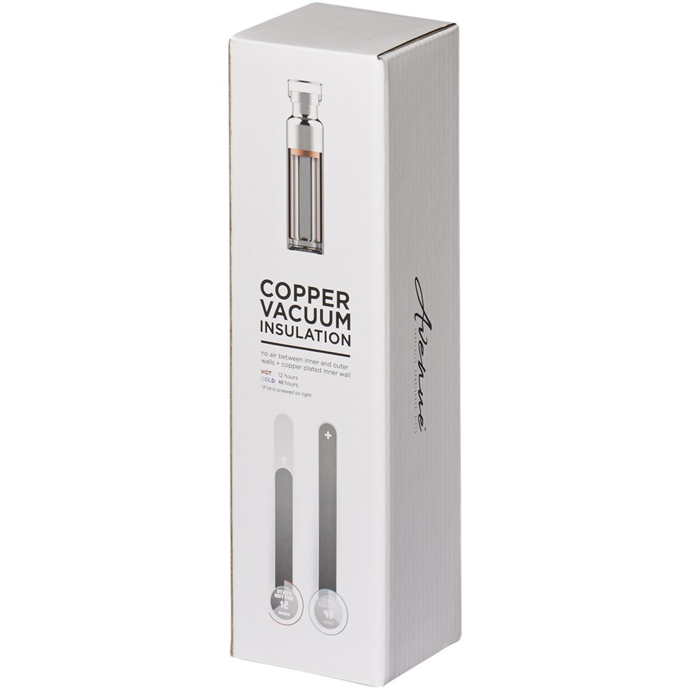 Langlebige, doppelwandige Edelstahl Vakuum Konstruktion mit Kupfer Isolierung, die Ihr Getränk kalt für 48 Stunden hält und mindestens 12 Stunden heiße Getränke ermöglicht. Die Konstruktion verhindert Kondensation an der Außenseite der Flasche. Moderne, langlebige Pulverbeschichtung. Edelstahl auslaufsicherer Schraubverschluss mit haltbarer Edelstahl Handschlaufe. Weite Öffnung für leichtes Füllen und Gießen. Perfekt für Eiswürfel. Volumen 650 ml. Verpackt in einer Avenue Geschenkbox.
