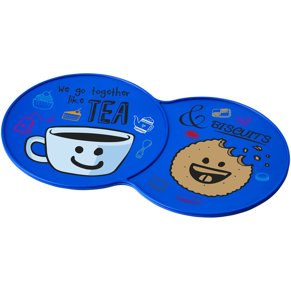 Vergrößerter Untersetzer mit Platz für mehrere Getränke oder eine Kombination aus einem Getränk und einem Keks.