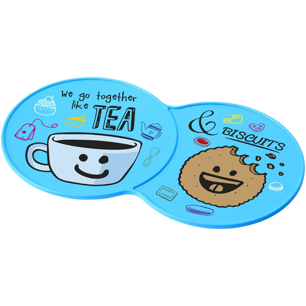 Vergrößerter Untersetzer mit Platz für mehrere Getränke oder eine Kombination aus einem Getränk und einem Keks.
