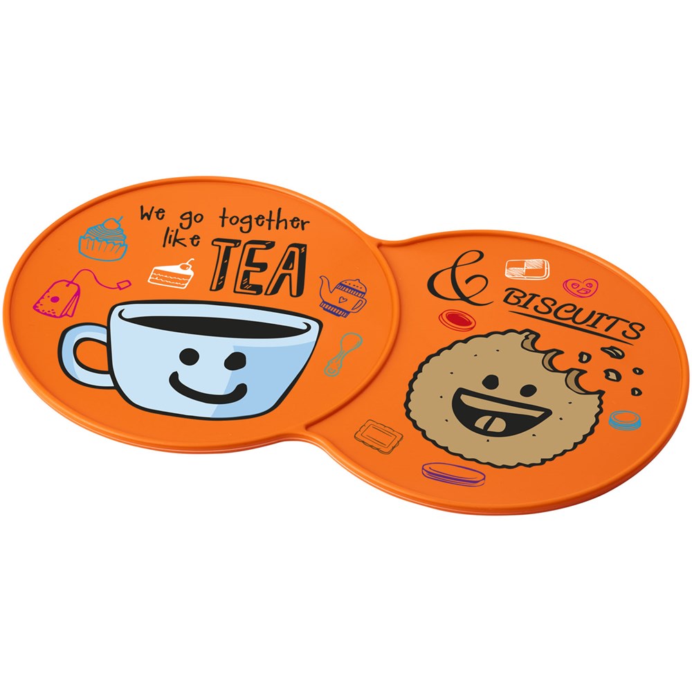 Vergrößerter Untersetzer mit Platz für mehrere Getränke oder eine Kombination aus einem Getränk und einem Keks.