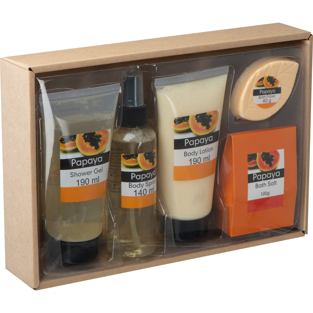 5-teilges Badeset bestehend aus jeweils einem Duschgel, einem Bodyspray, einer Body Lotion, einem Badesalz und einer Seife. Die Werbung wird mittels Etikett auf der Einzelverpackung angebracht.