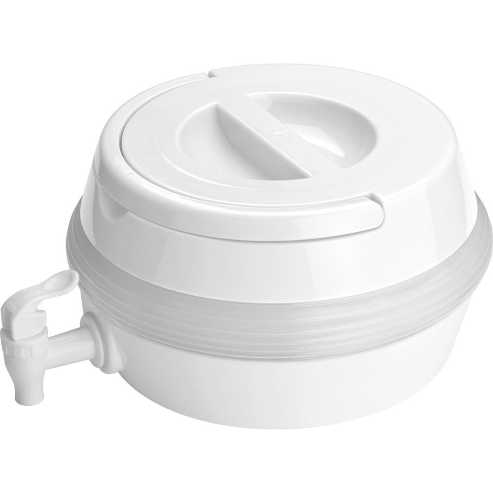 Zusammenfaltbarer Getränkespender aus Kunststoff mit einem Füllvermögen von 7500ml. Ideal zum Verstauen im Kofferraum. Die Werbung wird auf den Deckel gedruckt.