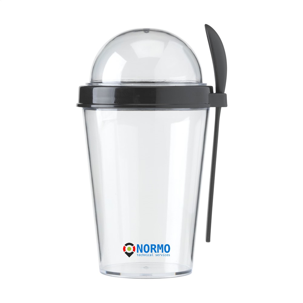 Transparenter Joghurtbecher aus Kunststoff mit separatem Fach, in dem Müsli oder Obst trocken bleiben. Mit passendem Löffel.