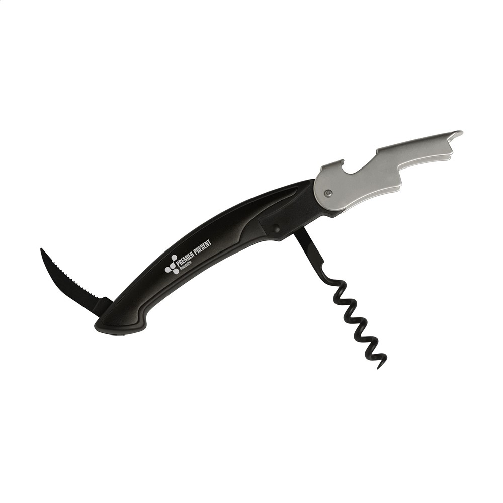 Exquisites Design - ausklappbares Kellnermesser aus rostfreiem Stahl mit Aluminium. Mit Korkenzieher, Flaschenöffner und Folienschneider. Pro Stück in einer Verpackung.