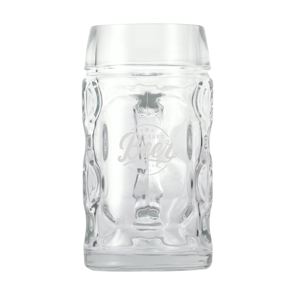 Extragroßer Bierkrug aus Glas, mit Henkel. Geeignet für Restaurants und für Events. Auch für eine auffällige Werbung während der Volksfeste. Fassungsvermögen: 500 ml.