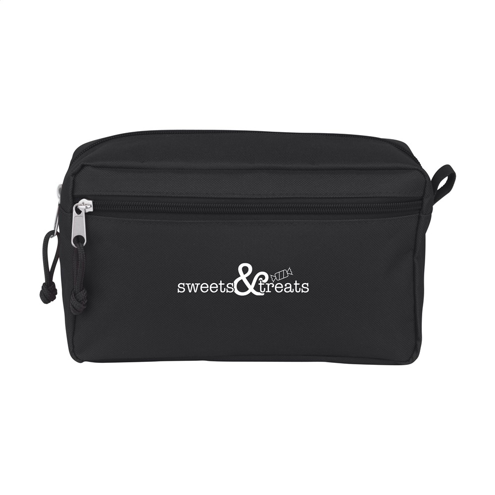 Geräumiges Etui aus 600D-Polyester zur Aufbewahrung von Make-Up oder Kosmetikartikeln. Mit Aufhängeschlaufe und zusätzlicher Reißverschlusstasche.