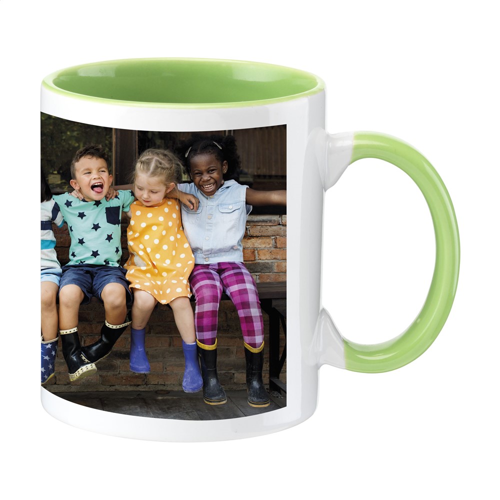 Hochwertige Tasse aus Keramik mit farbiger Innenseite. Die Farbe des großzügigen Henkels gleicht der Farbe der Innenseite, was für einen spezielen Effekt sorgt. Die perfekte Tasse für alle Drucke in Full Colour, auch Fotos. Spülmaschinengeeignet. Fassungsvermöge: 350 ml.