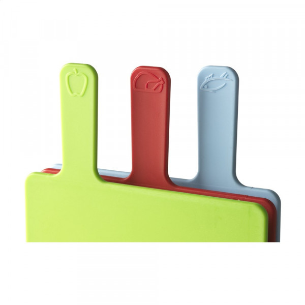 Kompaktes, farbenfrohes Set aus drei glatten Schneidebrettchen aus Plastik in einer silbernen Halterung. Die Nutzung von verschiedenen Brettchen für Früchte und Gemüse (grün), Fleisch (rot) sowie Fisch (blau). Praktisch und hygienisch.