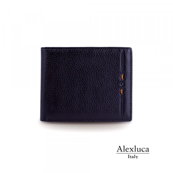 Geldbörse von Alexluca aus elegantem schwarzem Leder - angenehm anzufassen. Mit zwei Geldscheinfächern, transparentem Ausweisfach und 5 Kartenfächern. Innen gefüttert. Präsentiert in einer eleganten Tasche und einem individuellem Etui mit Magnetverschluss und Markenlogo.