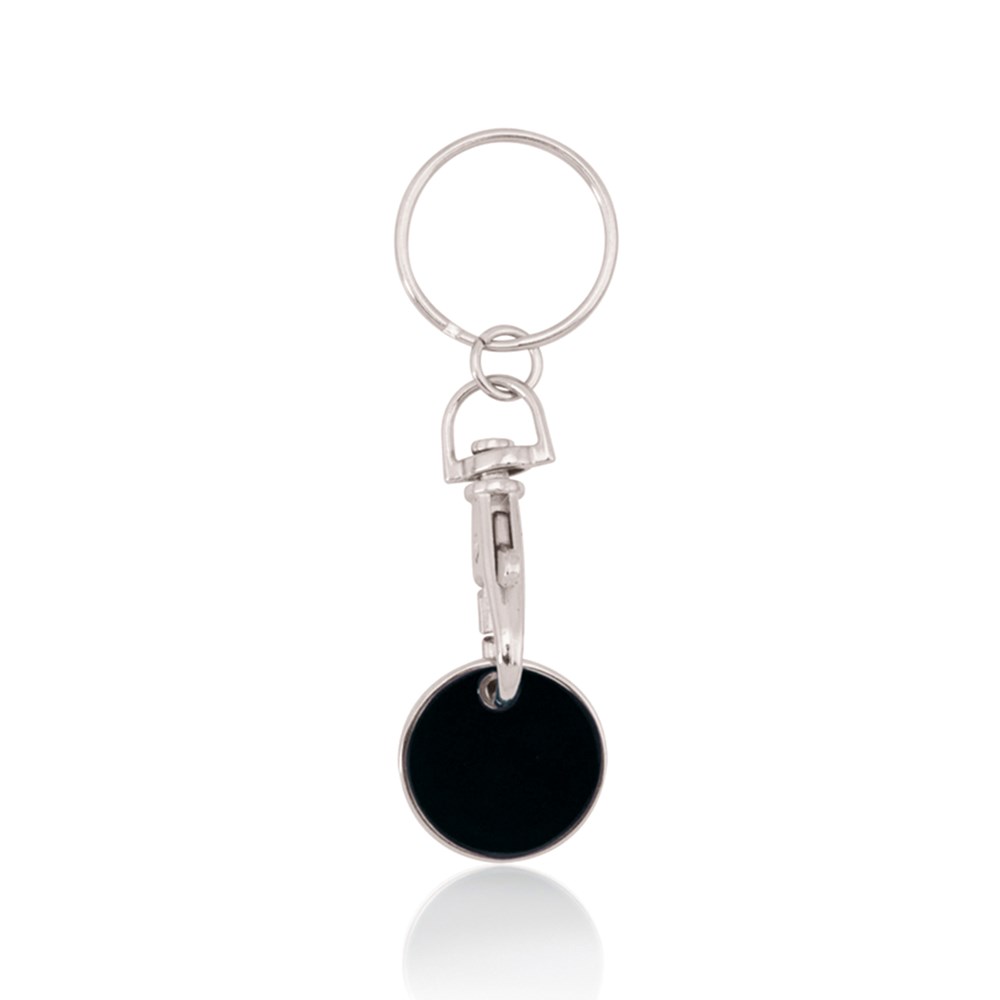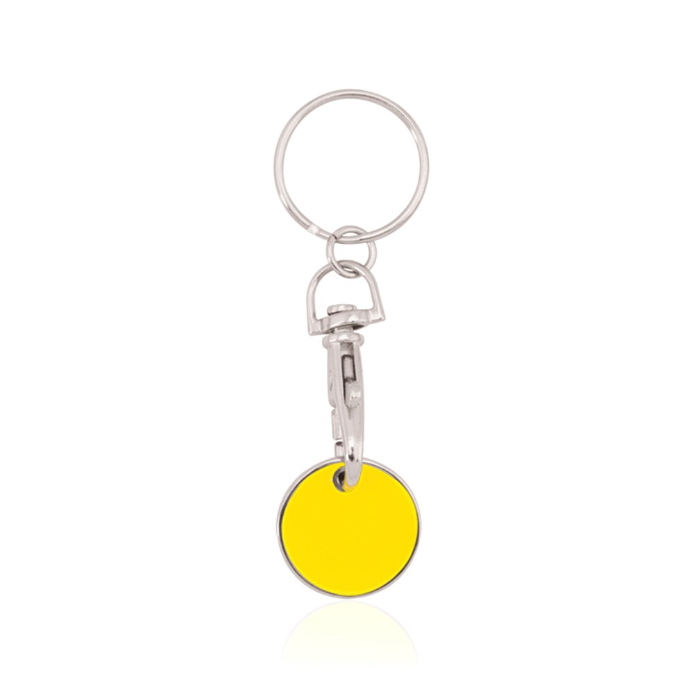 Schlüsselanhänger aus Metall mit fröhlichem Design in verschiedenen Farben. Mit abnehmbarer Münze und Befestigungskarabiner.