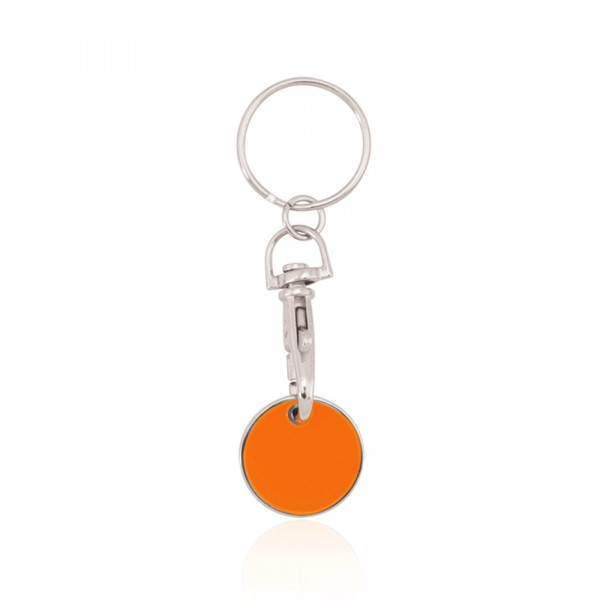 Schlüsselanhänger aus Metall mit fröhlichem Design in verschiedenen Farben. Mit abnehmbarer Münze und Befestigungskarabiner.
