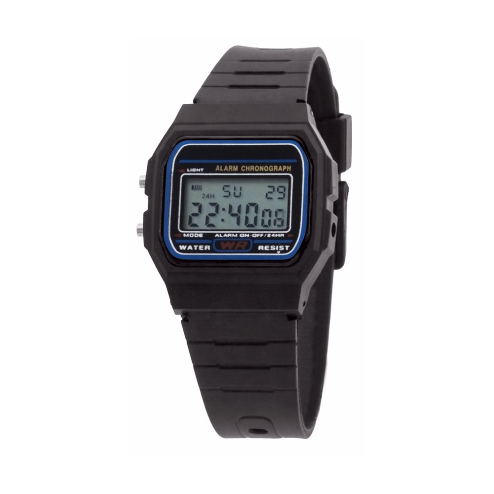 Digitale Armbanduhr mit Retro-Design in coolen Farben. Mit farblich passendem spritzwassergeschütztem Gehäuse und Armband, Timer-Funktion und Hintergrundbeleuchtung. Präsentiert in einer individuellen Tasche mit Verstärkungskarton.