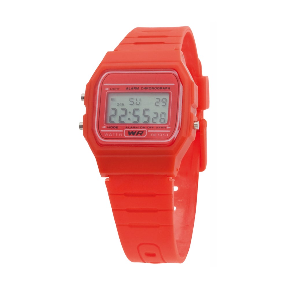 Digitale Armbanduhr mit Retro-Design in coolen Farben. Mit farblich passendem spritzwassergeschütztem Gehäuse und Armband, Timer-Funktion und Hintergrundbeleuchtung. Präsentiert in einer individuellen Tasche mit Verstärkungskarton.