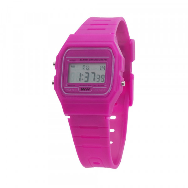 Digitale Armbanduhr mit Retro-Design in coolen Farben. Mit farblich passendem spritzwassergeschütztem Gehäuse und Armband, Timer-Funktion und Hintergrundbeleuchtung. Präsentiert in einer individuellen Tasche mit Verstärkungskarton.