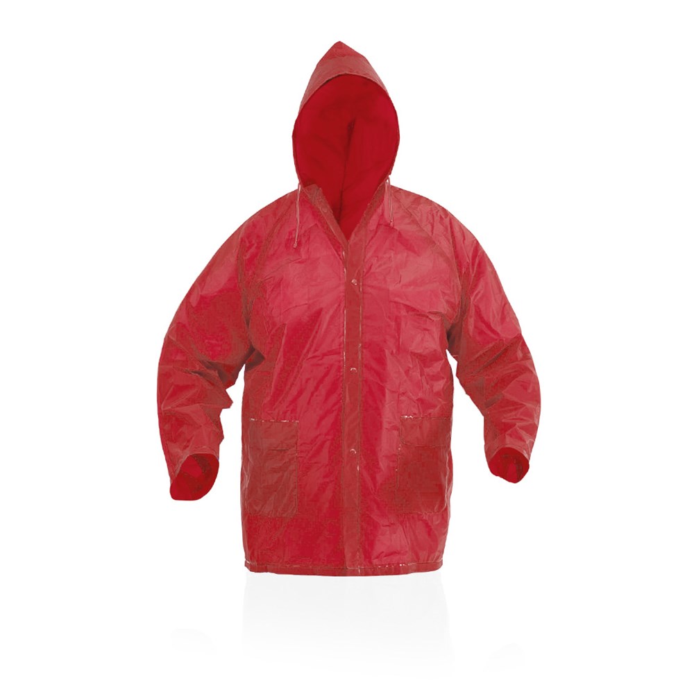 Regenmantel mit Knopfleiste aus widerstandsfähigem EVA mit hitzeversiegelter Oberfläche in vielen verschiedenen Farben. Mit Kapuze mit verstellbaren Kordeln sowie seitlichen Klappentaschen. Einheitsgröße für Erwachsene.