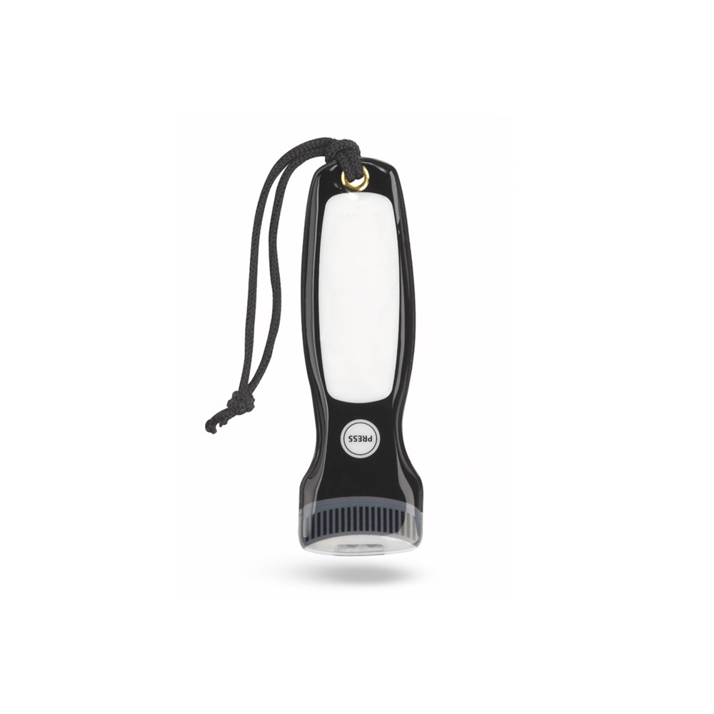 Taschenlampe mit 2 LEDs und extra flachem Design sowie rechteckigem Gehäuse aus PVC in verschiedenen lebendigen Farben. Trageschlaufe und Knopfzellen inklusive.