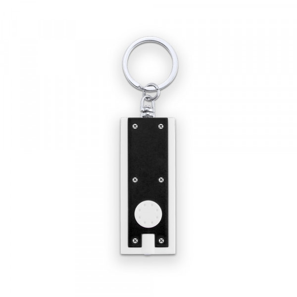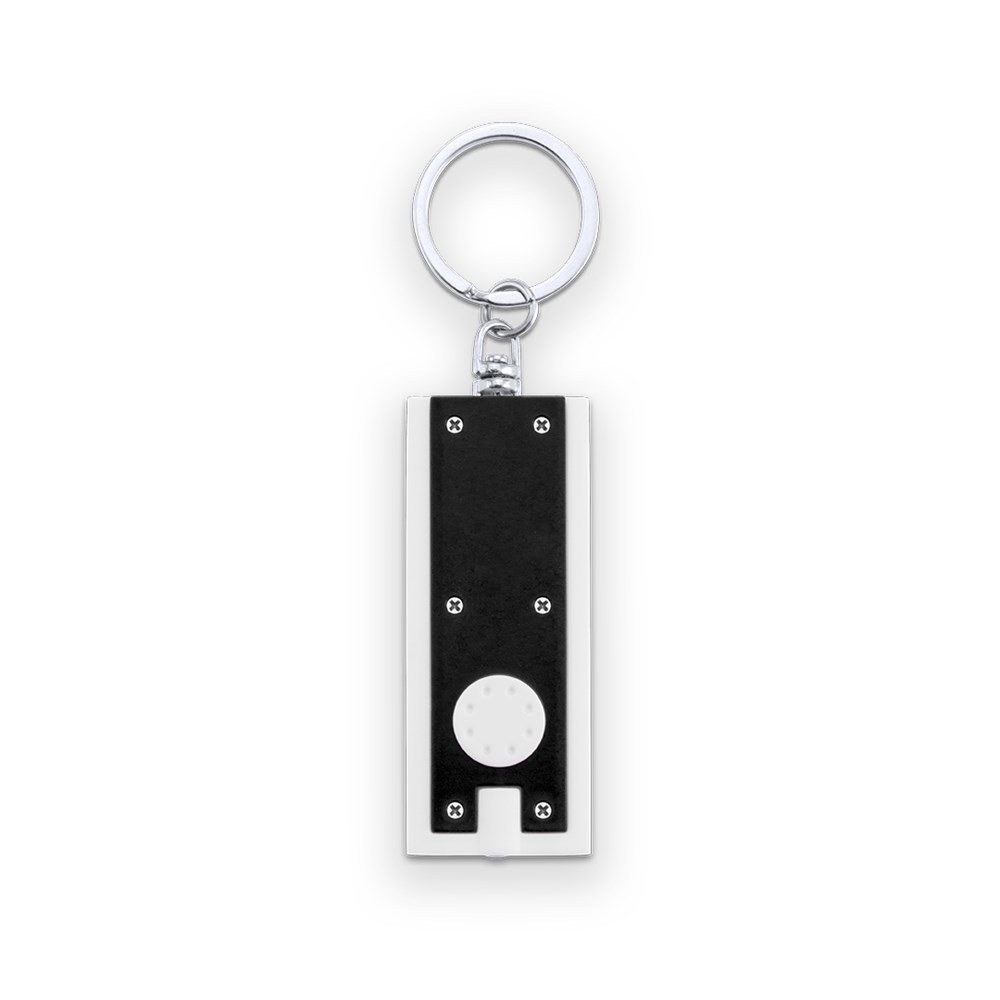 LED-Taschenlampe mit Schlüsselring und extra flachem Design in glänzenden Farben. Knopfzellen inklusive.