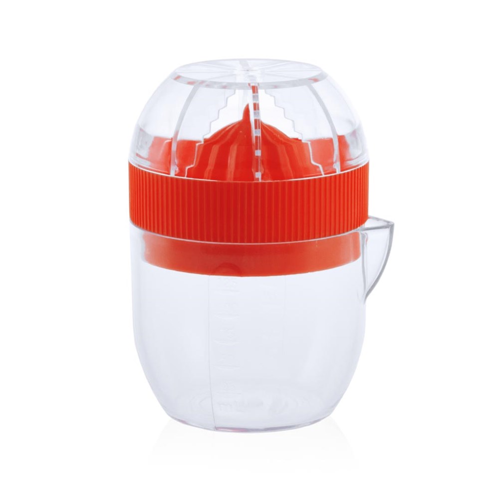 Manuelle Saftpresse mit 125 ml Fassungsvermögen sowie transparentem Körper mit Kontrastdetails in kräftigen Farben. Mit transparenter Sicherheitsabdeckung. Präsentiert in einer individuellen Box.