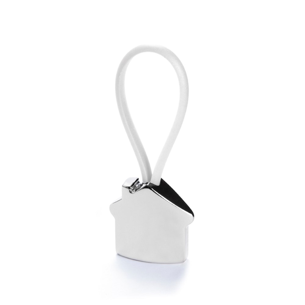 Metall-Schlüsselanhänger mit elegantem Haus-Design in 3D. Mit Gummiband in verschiedenen lebendigen Farben für die Befestigung der Schlüssel.
