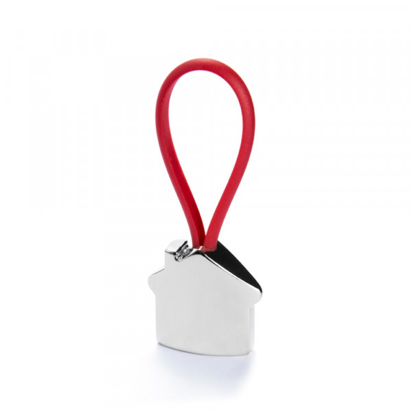 Metall-Schlüsselanhänger mit elegantem Haus-Design in 3D. Mit Gummiband in verschiedenen lebendigen Farben für die Befestigung der Schlüssel.